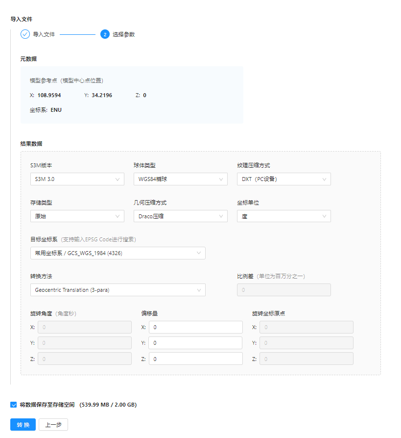 点击“OSGB转S3M”小工具,上传数据,根据需求选择参数,最下方请务必勾选“将数据保存至存储空间”,便于下一步发布服务。