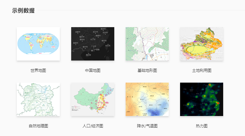 云端桌面提供多种在线示例数据,包括常用的World、China等地图底图,人口、经济类统计数据,土地利用、气候等行业数据,以及功能练习数据。可直接在线使用或以链接形式分享给他人使用。