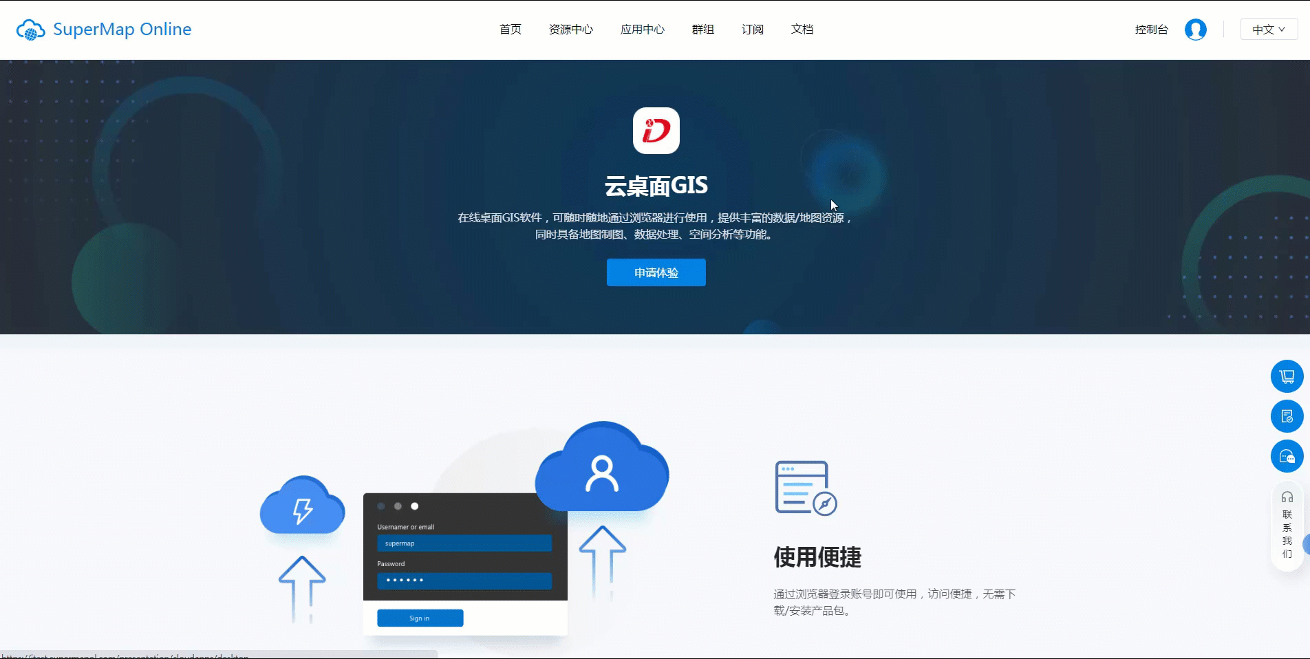 您可以在应用中心中点击云端桌面,在云端桌面介绍页面点击“申请体验”按钮。在申请体验对话框中填写相关信息并选择节点即可在线使用。